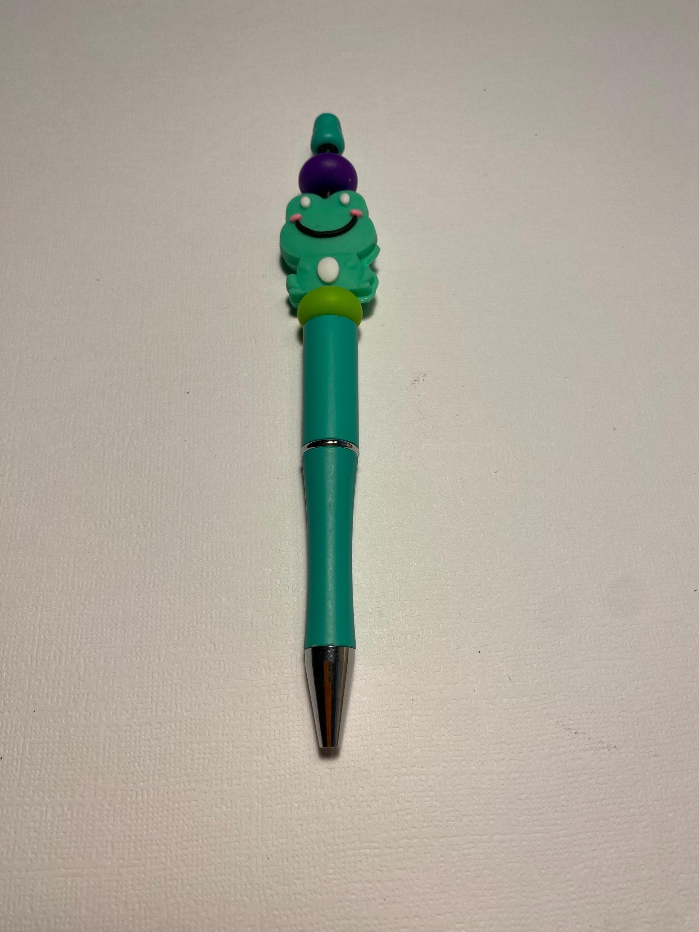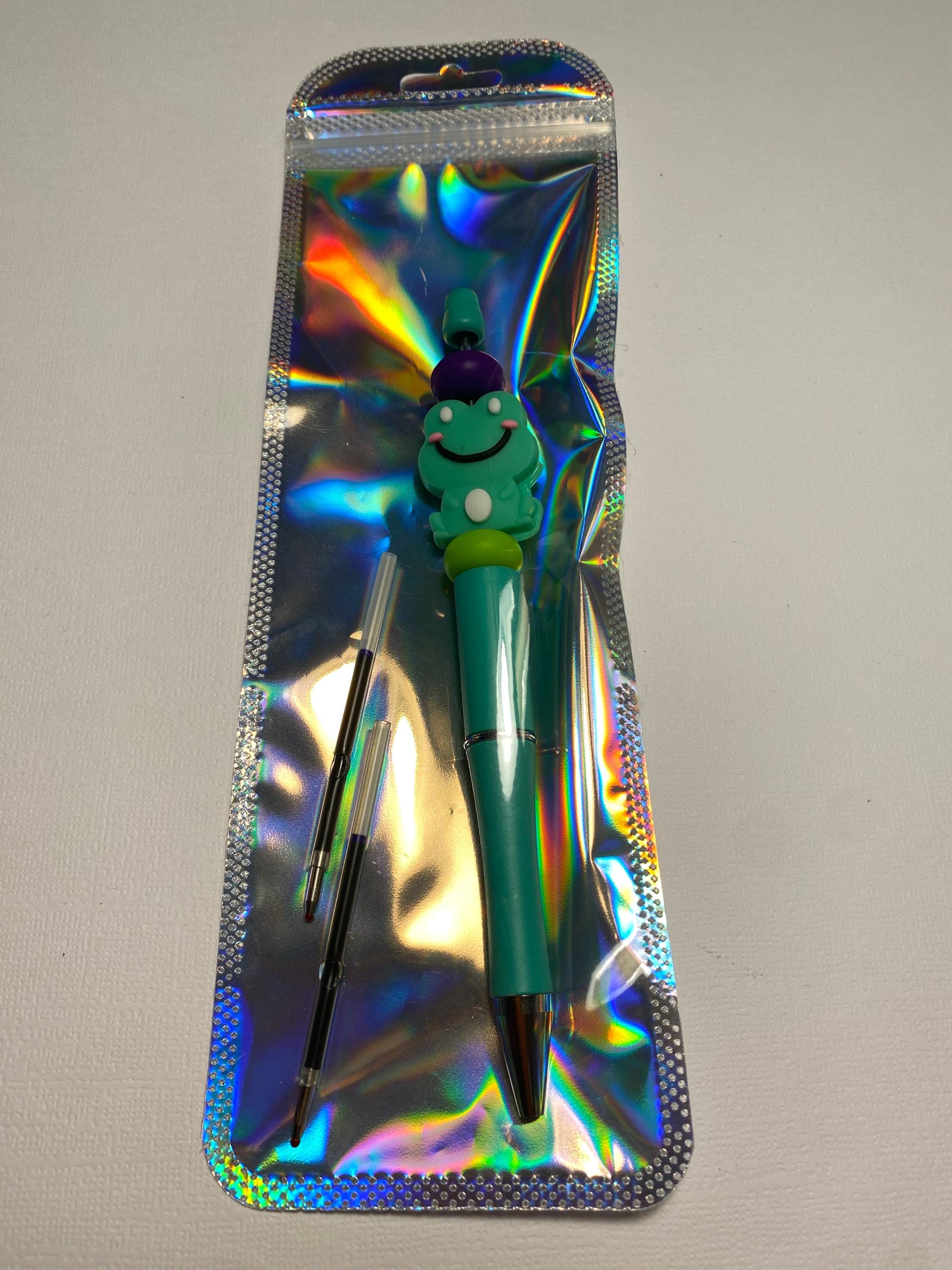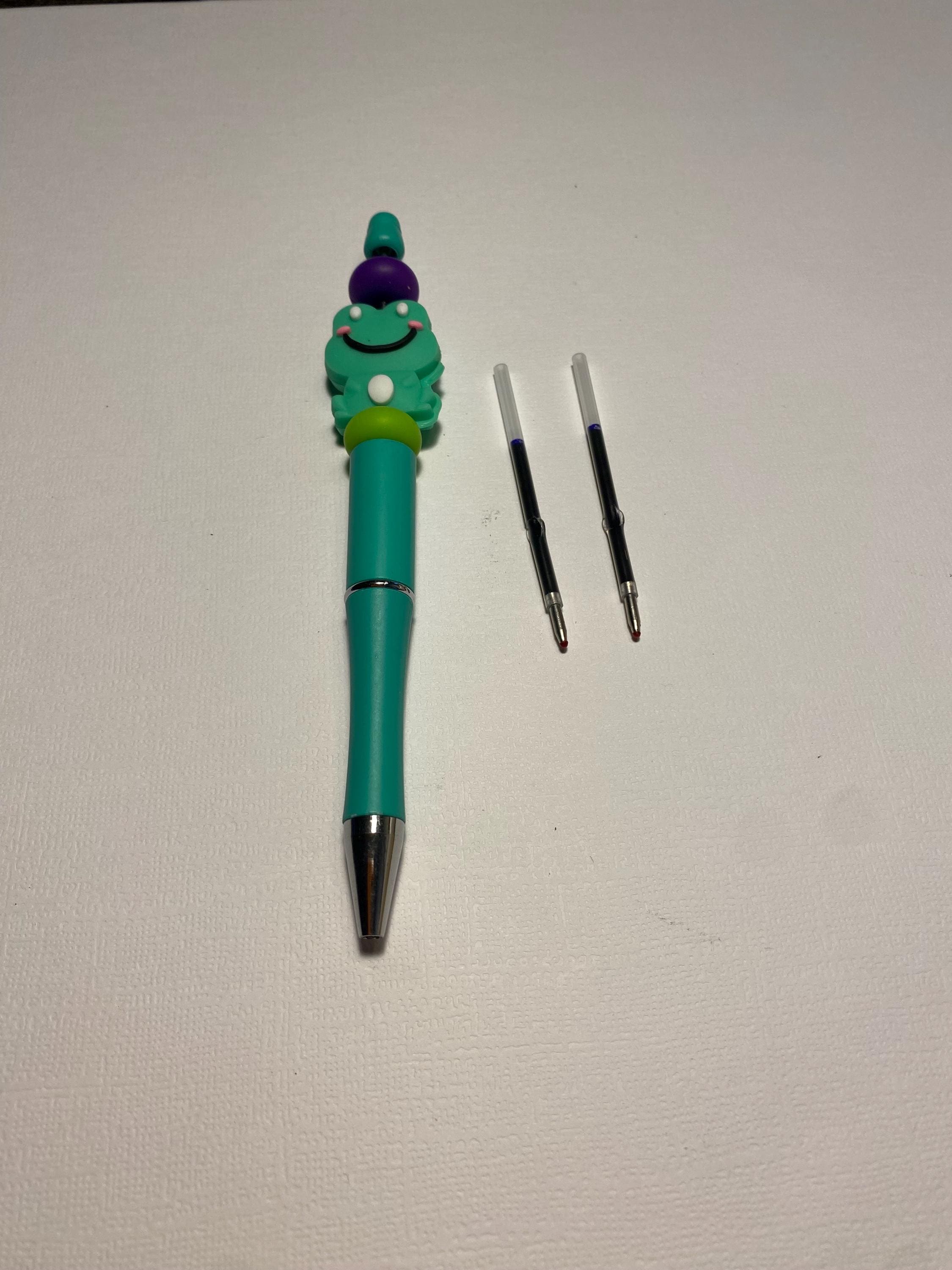 Ballpoint pen with a cute Green Frog charm. The beads and charm are interchangeable with other beads and charms. Writes in black ink. Comes with 2 refills.